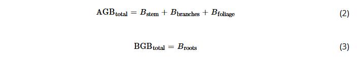 Total aboveground Equation (2) and belowground Equation (3) biomass was then calculated