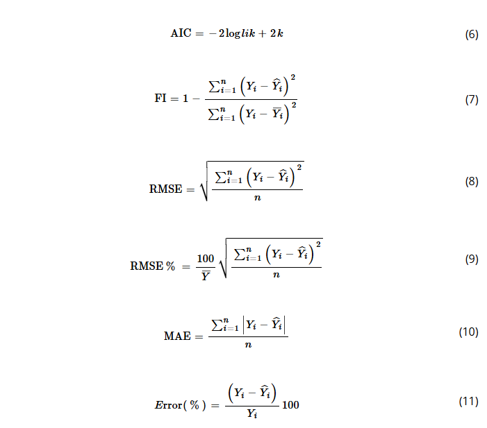 Model selection was guided by Taylor’s diagram, which provides a graphical representation of model performance by statistics, including correlation coefficient, standard deviation, and root mean square error (Taylor 2001). This visualization facilitated the comparison of multiple models and helped identify the most robust and parsimonious approach. Additionally, the following statistical metrics were employed: Akaike information criterion (AIC, Equation (6)), fit index (FI, Equation (7)), root mean square error in absolute terms (RMSE, Equation (8)) and in percentage (RMSE%, Equation (9)), and mean absolute error (MAE, Equation (10)). To further validate model reliability, we applied residual analysis, including residual plots and histograms of percentage error (%) Equation (11), in which k is the number of parameters in the model, n is the total number of observations,