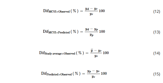 Thus, we assumed BEF (Eucalyptus spp.: 1.20, and Pinus spp.: 1.25), and R (0.35 for both genera) default values for Brazil based on MCTI (2004). Therefore, the following comparisons (Equation (12 up to 15)) were established in percentage terms (Dif%), in which yd is Brazil’s default based on MCTI value for BEF or R, yr is observed BEF or R values for each temperature or age class, yp is predicted BEF or R values from models developed in this study for each temperature or age class, and ȳ is the general average of BEF and R for each genus obtained from the data observed in the sampling of this study.