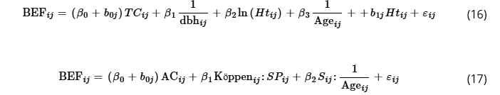 where BEFij is the biomass expansion factor (dimensionless), TCij is the temperature class, dbhij is the diameter at 1.30 m aboveground (in centimeters), Ageij is the stand age (in years), Htij is the total height (in meters), ACij is the age class, Köppenij is the Köppen climate classification, SPij is a dummy variable for species (1–Pinus caribaea var. hondurensis, and 0–Pinus taeda), Sij is the slenderness degree, βi represents fixed coefficients, b0j and b1j are random coefficients based on temperature classes and total height for Eucalyptus spp. and age classes for Pinus spp., and subscripts i, j refer to the individual tree i of temperature class j or age class j according to the genera; εij N (0, σ2I) and bj N (0, σ2D).TABLE 2. Parameter estimates and goodness-of-fit statistics from ten-fold evaluation for linear mixed-effects models used in the biomass expansion factor (BEF) predictions.